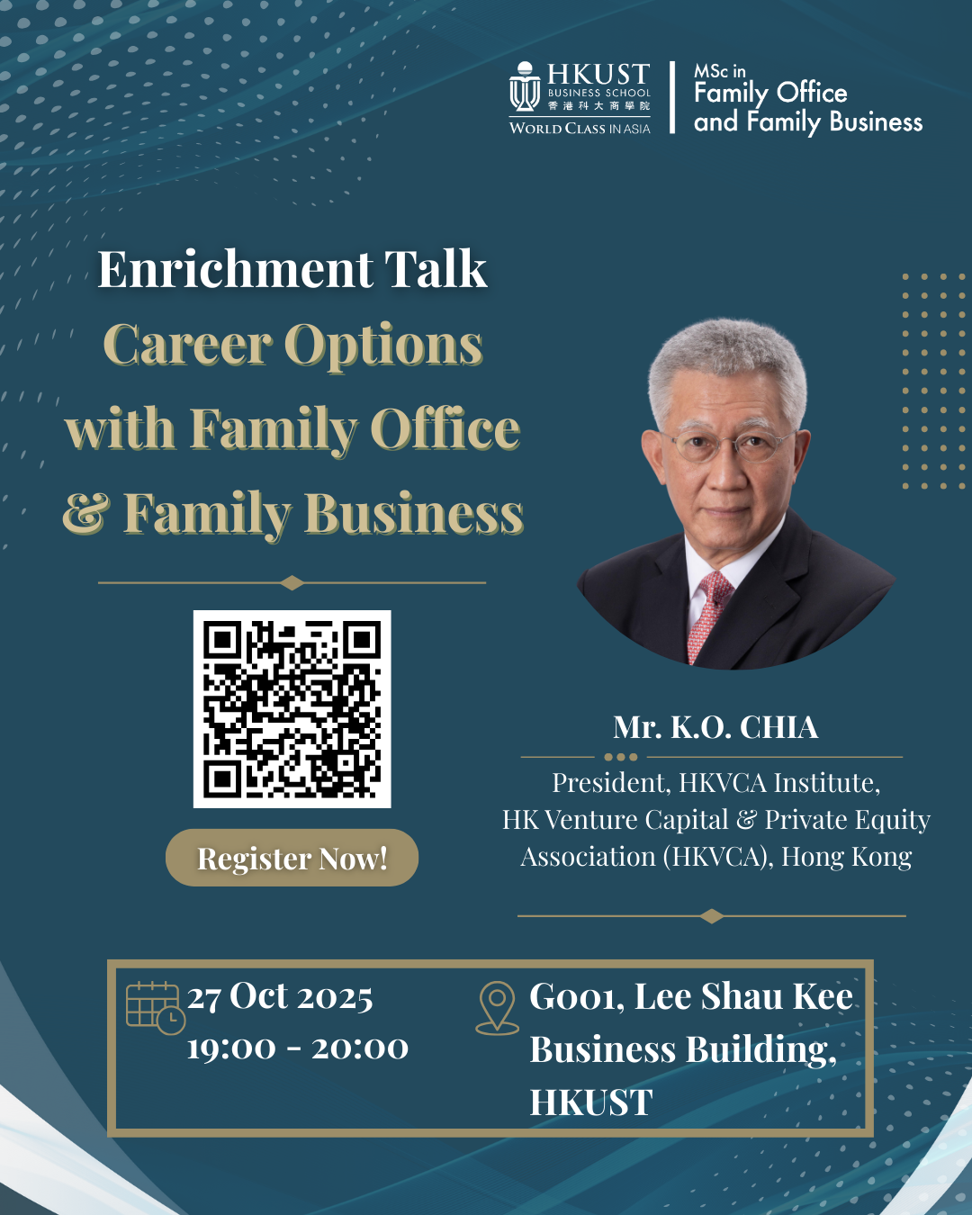 The Master of Science in Family Office and Family Business (MScFOFB) program seamlessly merges tradition with innovation, empowering the next generation of family business leaders. It equips students with the essential knowledge and skills to navigate the unique challenges of managing family-owned enterprises. With flexible full-time and part-time options, the program fosters valuable networking, mentorship, and experiential learning opportunities. Graduates emerge with the tools and confidence to lead their family businesses or excel in the dynamic field of family office management.