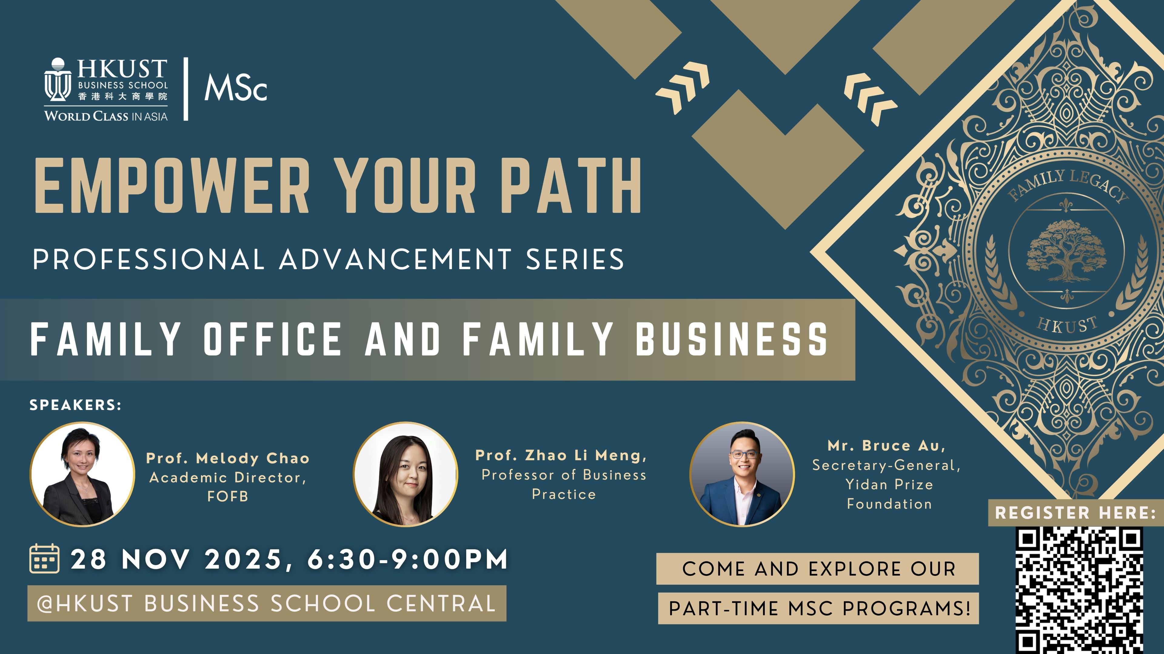 We are excited to have the “Empower Your Path: Professional Advancement Series spotlight the MSc in Family Office and Family Business Program. This exclusive event will provide an in-depth look into how MScFOFB part-time program equips professionals with advanced expertise to lead the future of family office and family business, shaping the next generation of family wealth management.